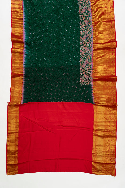 Green And Red Kanchi Bandhini Saree With Embroidery