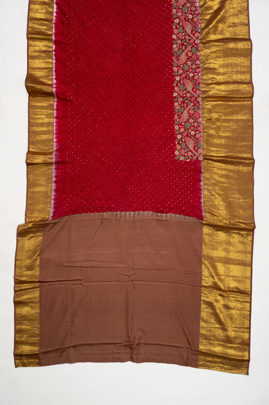 Red And Gold Kanchi Bandhini Saree With Embroidery