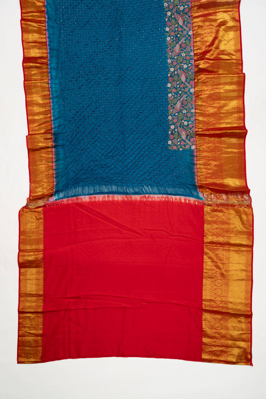 Mavericks Blue And Red Kanchi Bandhini Saree With Embroidery