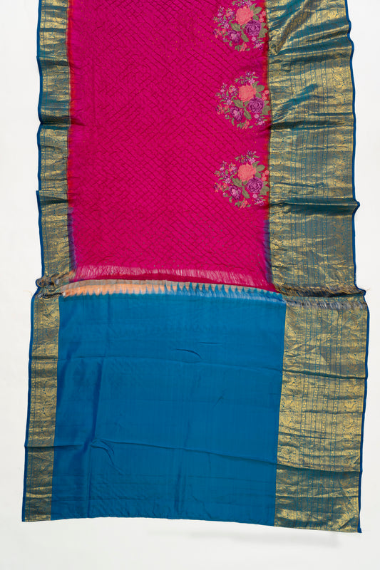 Cherry Pink And Blue Kanchi Bandhini Saree With Embroidery