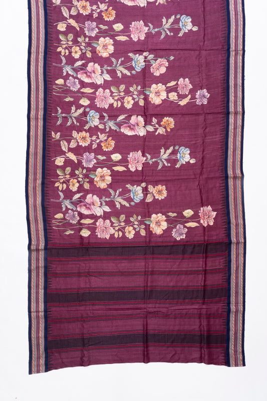 Wine And Navy Blue Printed Tussar Silk Saree