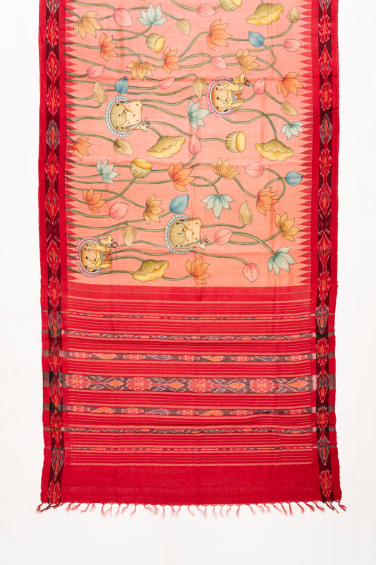 Soft Peach And Red Pichwai Printed Tussar Silk Saree
